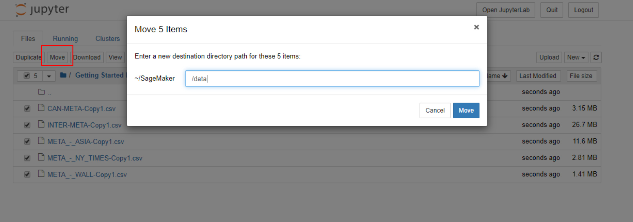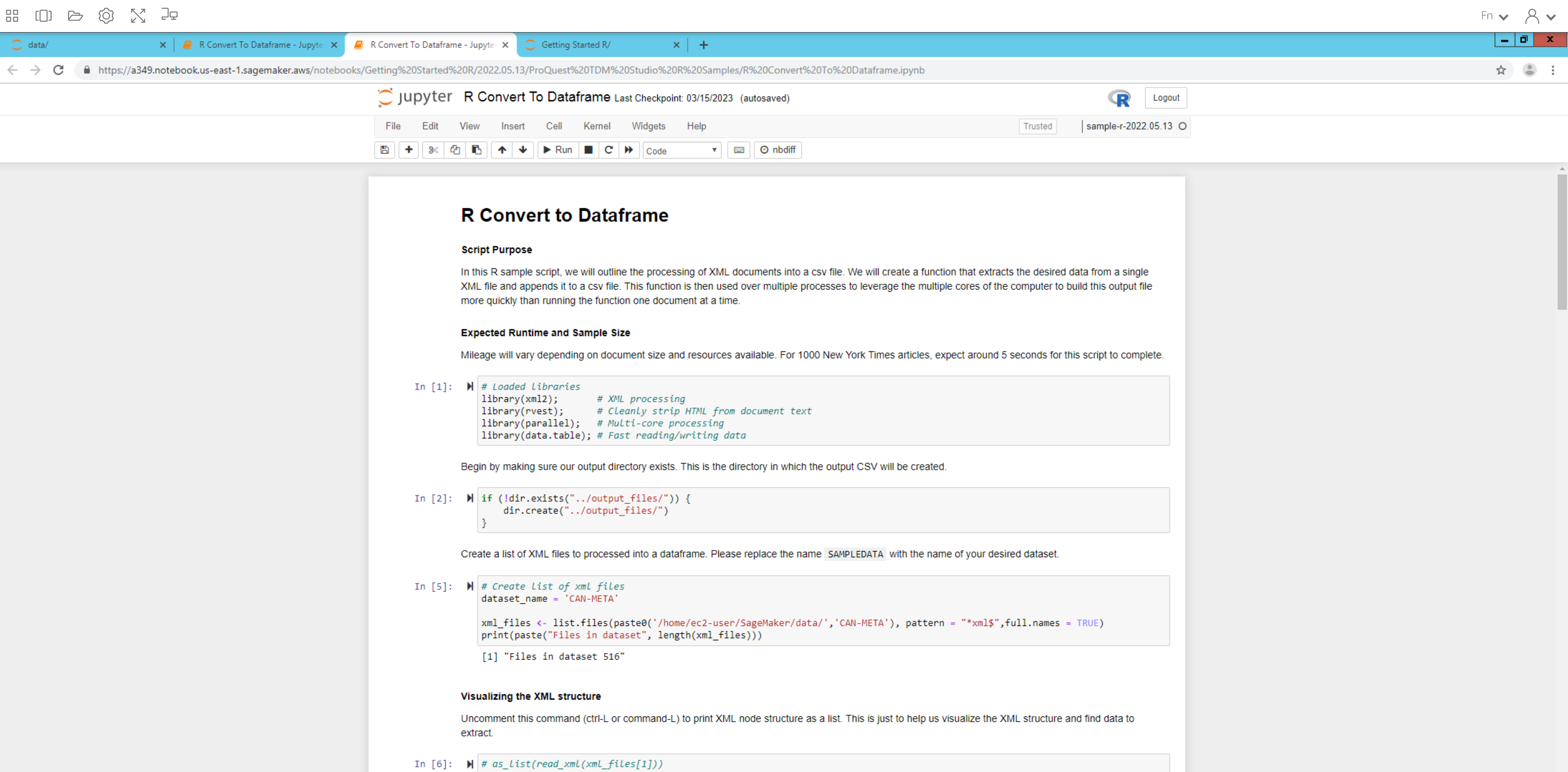 7) 그 다음, Getting Started 로 가셔서 Getting Started/2022.05.25/ProQuest TDM Studio Manuals에서 Export_Instructions.ipynb 파일로 가신 후, R 파일에 저장되어 있던 파일 경로를 data_to_export='/home/ec2-user/SageMaker/data/데이터파일명.csv') 로 바꿔줍니다. 파일만 됩니다. 폴더가 안 되는 점 참고해주세요!