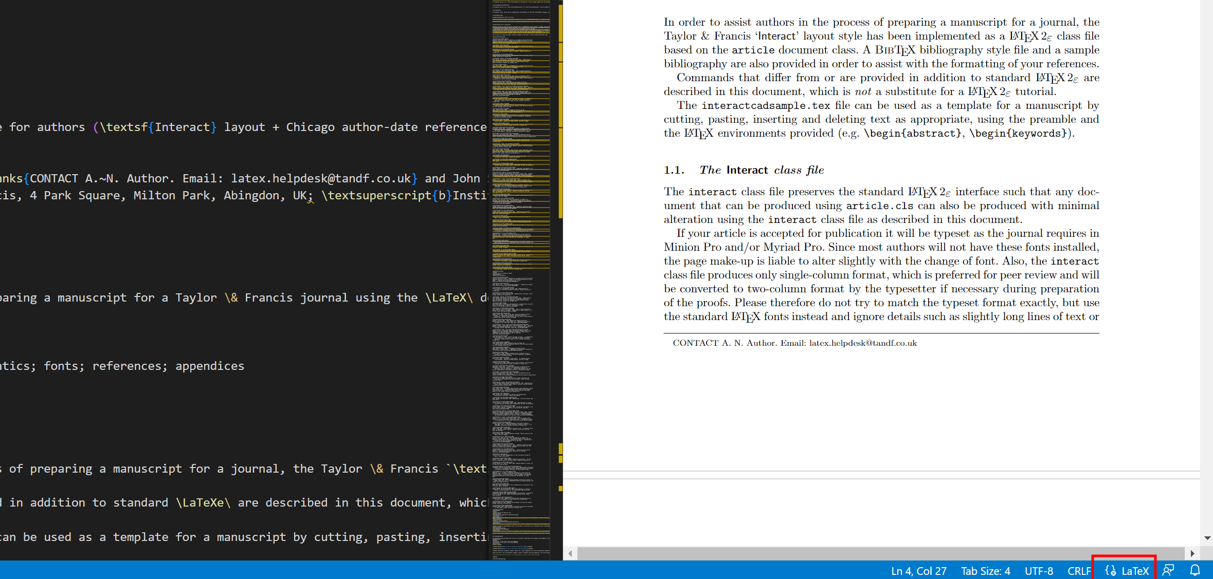 3) LaTex file을 VSCODE에서 열어서 기타 시스템 상 문제가 없다면 템플릿을 사용할 때 이하와 같이 flie을 compile 하고, view 할 수 있음