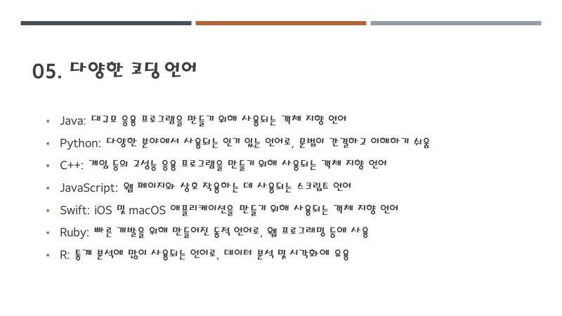 코딩에는 다양한 프로그래밍 언어가 있습니다. 몇 가지 대표적인 언어는 다음과 같습니다.
