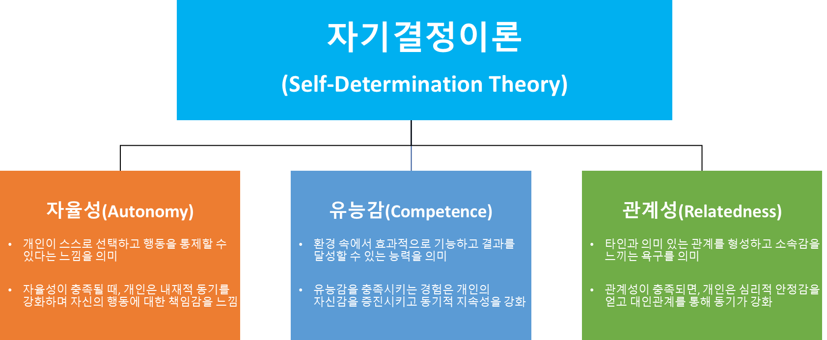 자기결정 이론은 인간이 내재적으로 성장하고 스스로 동기를 부여받기 위해 기본적으로 충족되어야 하는 자율성, 유능감, 관계성 3가지 요소를 강조, 세 가지 욕구가 충족되면 개인은 자율적이고 지속적인 동기를 유지하며, 심리적 웰빙과 성취감을 경험
