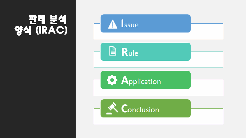 이와 유사하지만 조금 다르게, 사실, 절차 이력, 논지, 결론과 그 이유, 찬반 의견, 개인 사견, 관련 판례 등이 요구되는 경우도 있습니다. 물론 이 중 몇가지 요소들은 생략될 수도 있습니다.
