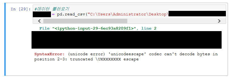 데이터를 불러올때, [변수]=pd.read_[파일 종류]("경로")로 python에서 작업할때, 자꾸 syntax error가 떠서 왜 그런가 했더니 역슬래쉬(\)로 되어 있어 그렇더군요. 역슬래쉬들을 "/" 로 바꿔주고 나서야 제대로 데이터들을 열 수 있었습니다.
